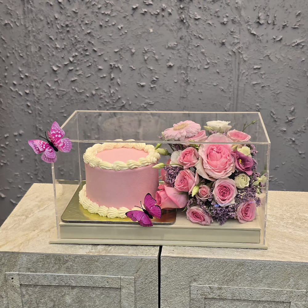 صندوق اكريلك يحتوي على الجوري، البيبي جوري والجيربيرا مع كيكة.