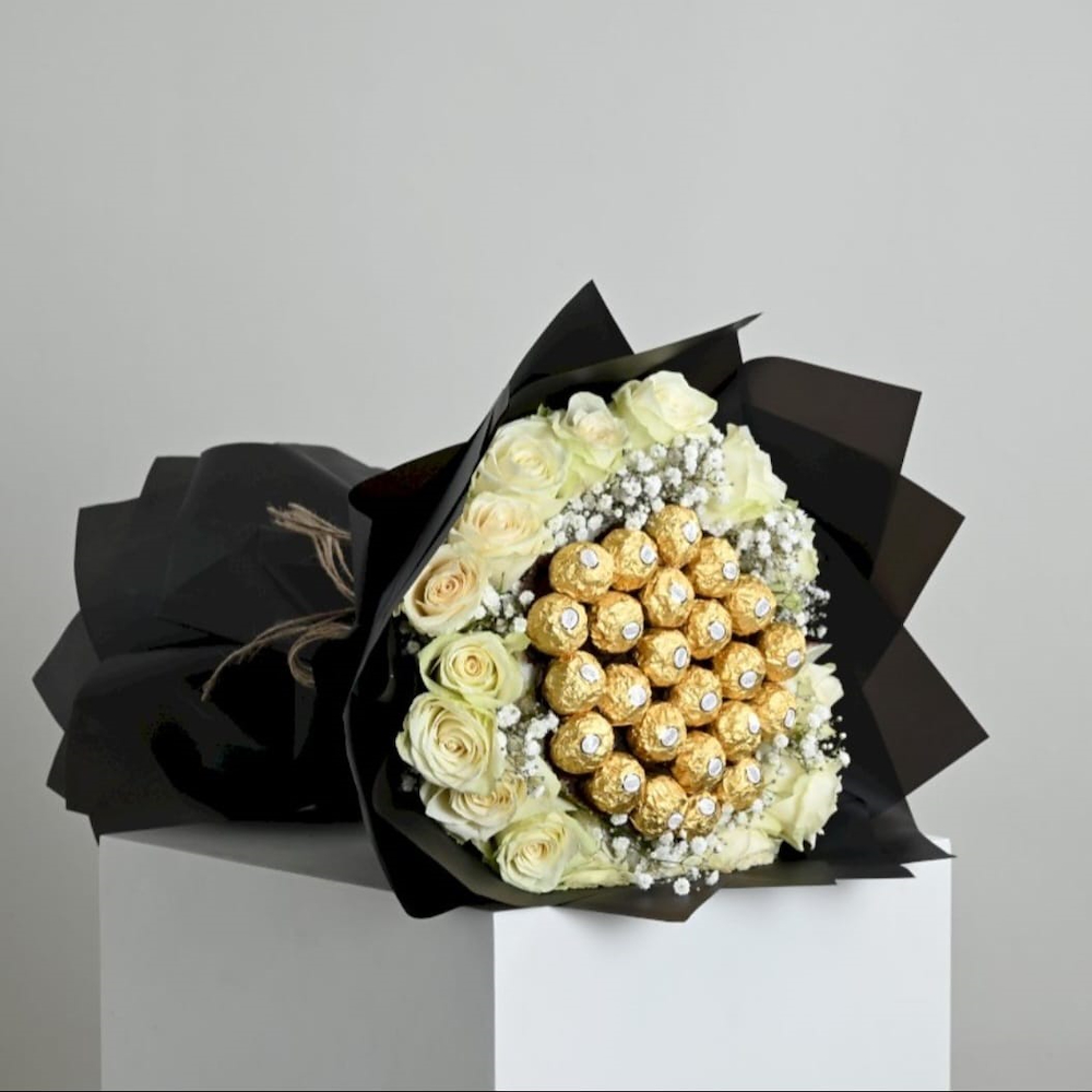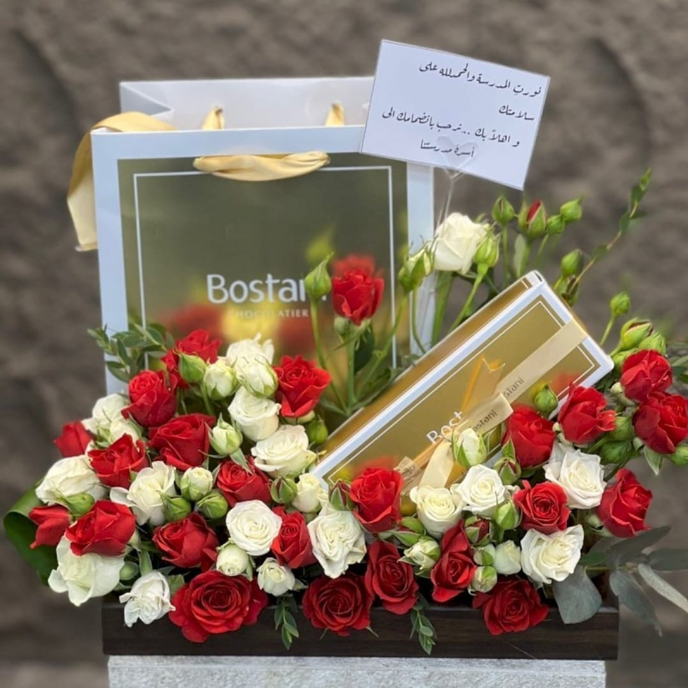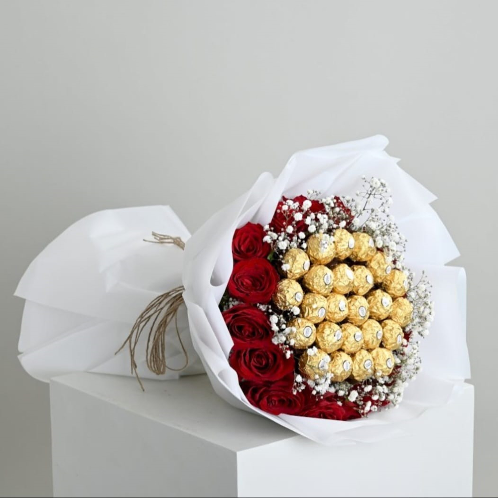 باقة مليئ بأزهار الجوري باللون الأحمر مع الشوكولاتة.