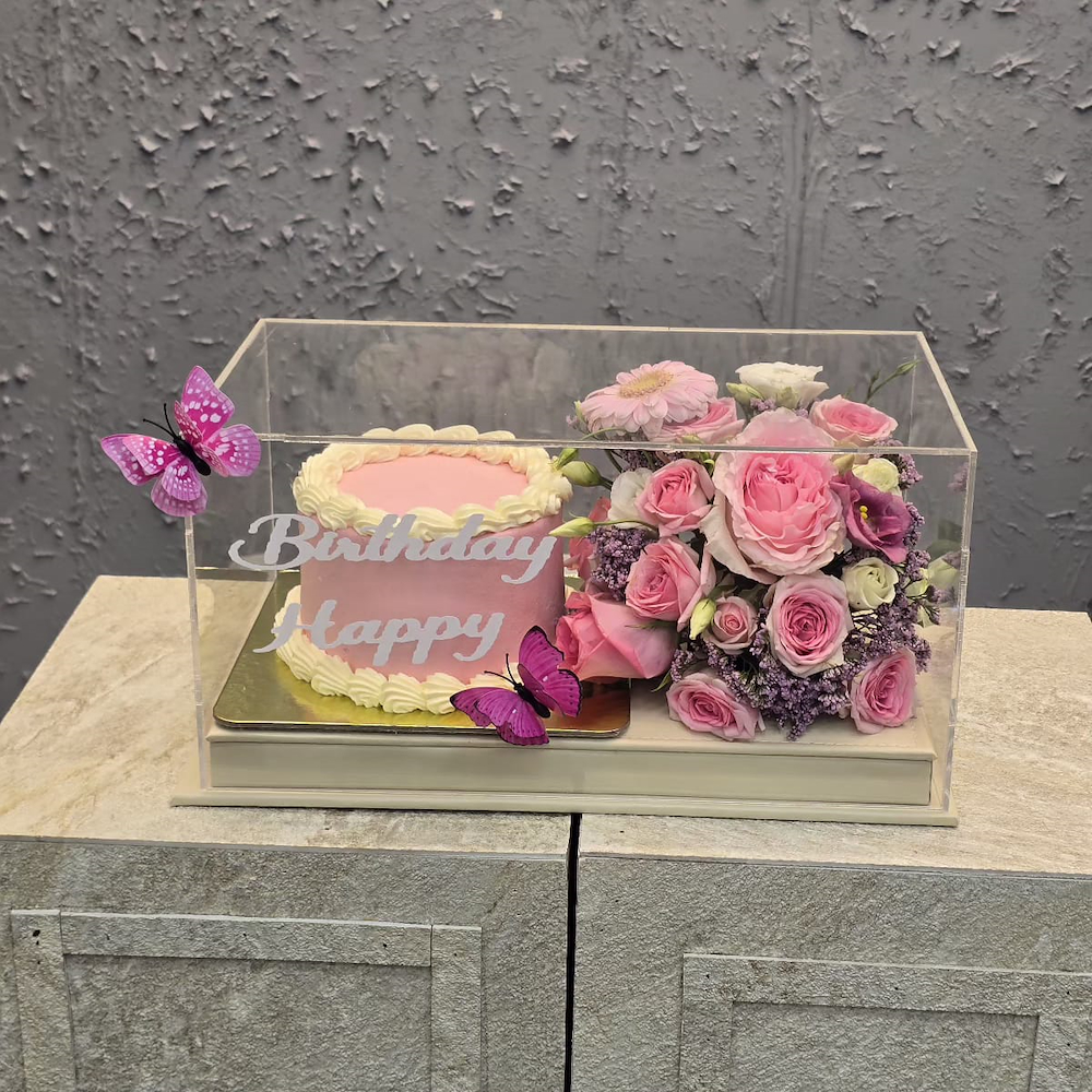 بوكس اكريلك مع الجوري الطبيعي مع كيكة عيد ميلاد من 5 الى 7 اشخاص بتنسيق جميل من الكازبلانكا والبيبي روز والاستوما.