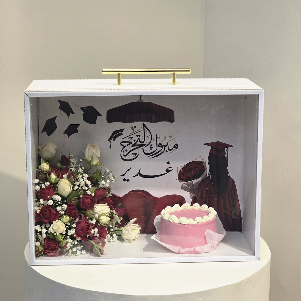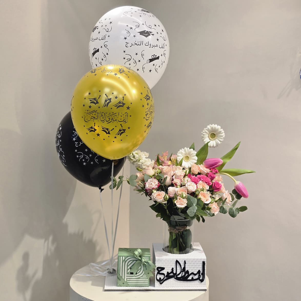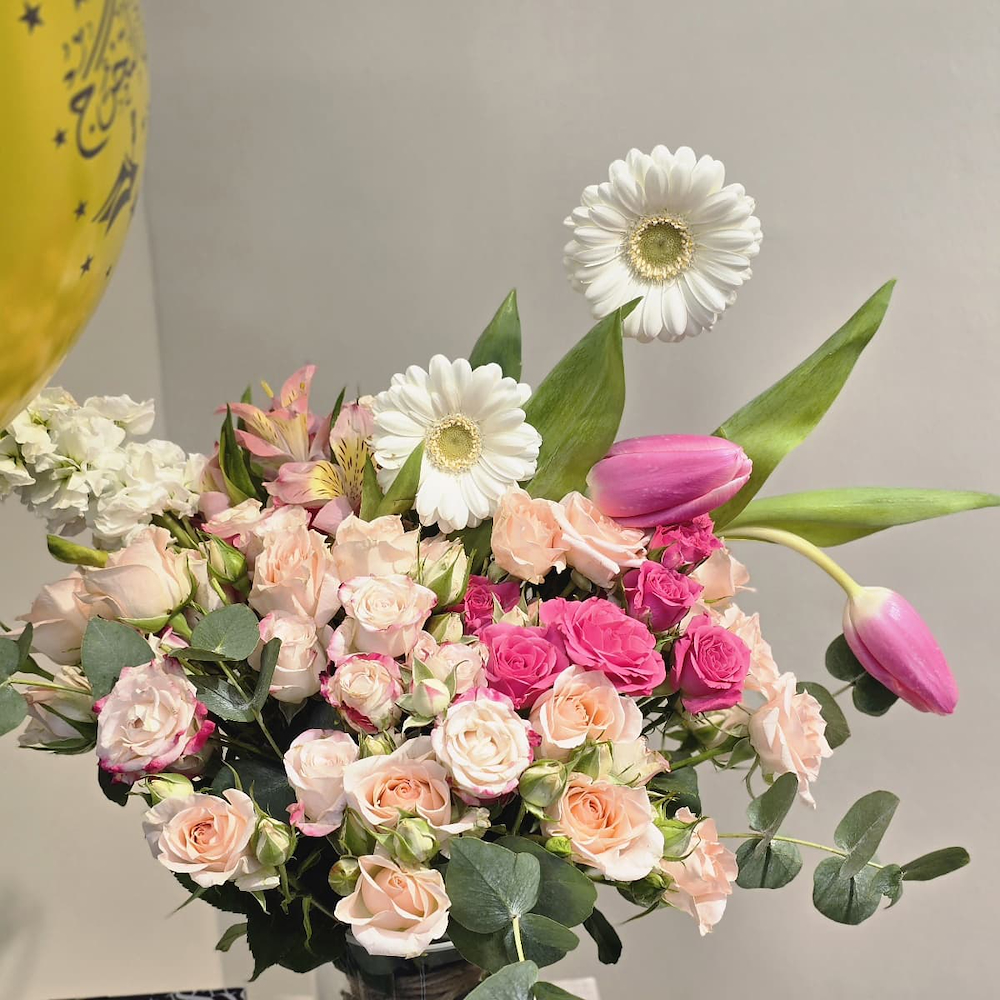 قاعدة تحتوي على فازة من الجوري، الجيربيرا، الماثيولا والتوليب مع الشوكولاتة من آني وداني والبالونات.