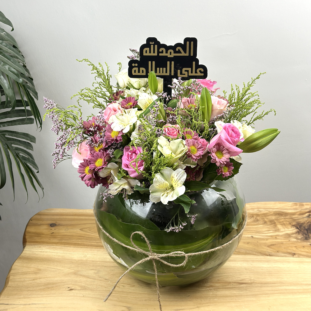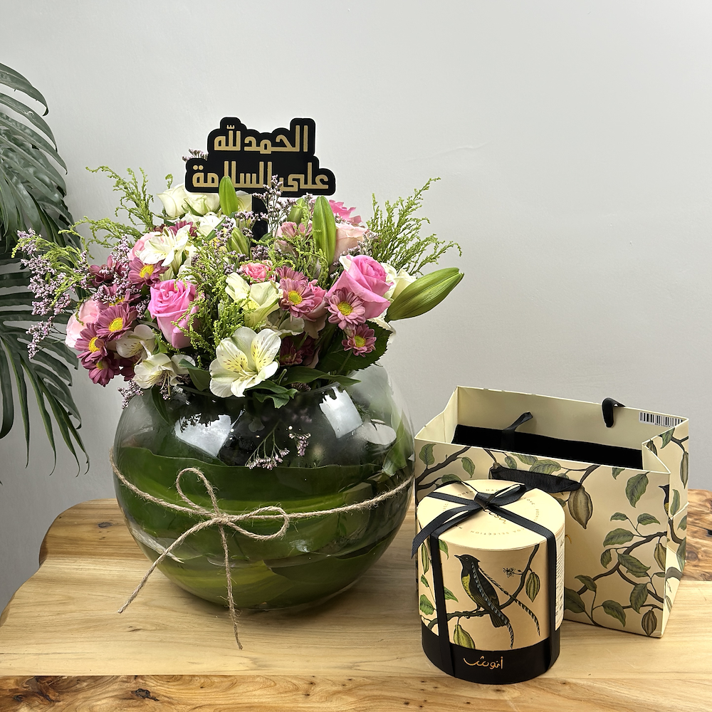 فازة أنيقة مليئة بأزهار الجوري السترومريا والليليز مع توبر أكريليك وشوكولاتة الويفر بوزن 250غ من انوش.