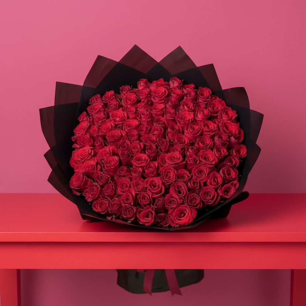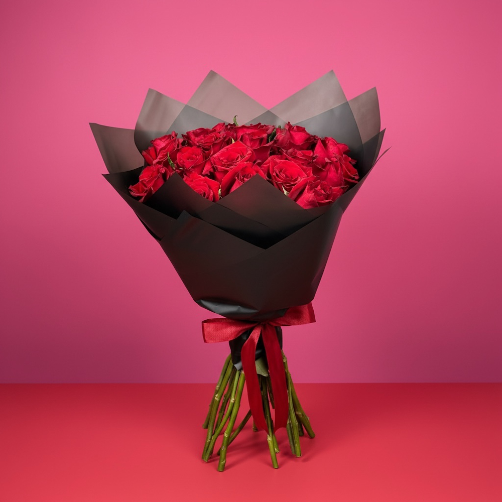 باقة مليئة بازهار الجوري باللون الأحمر.