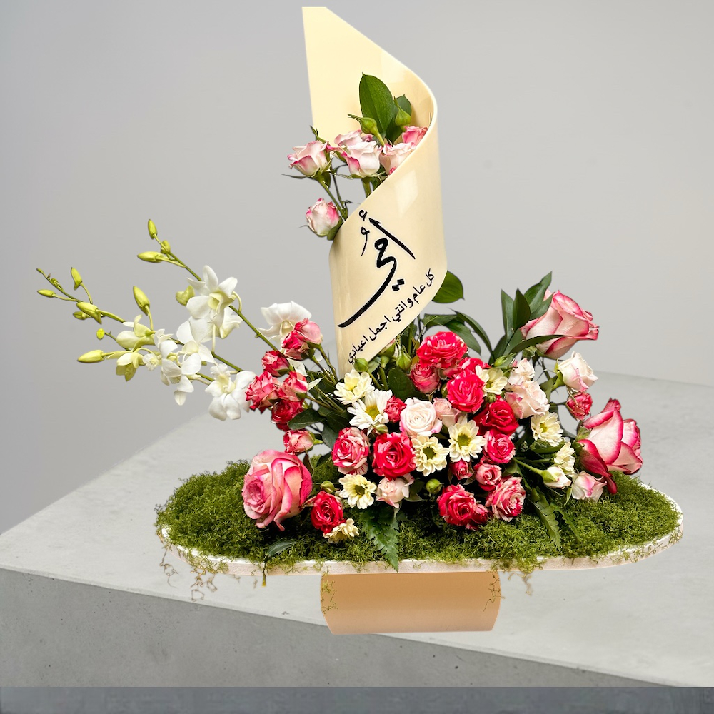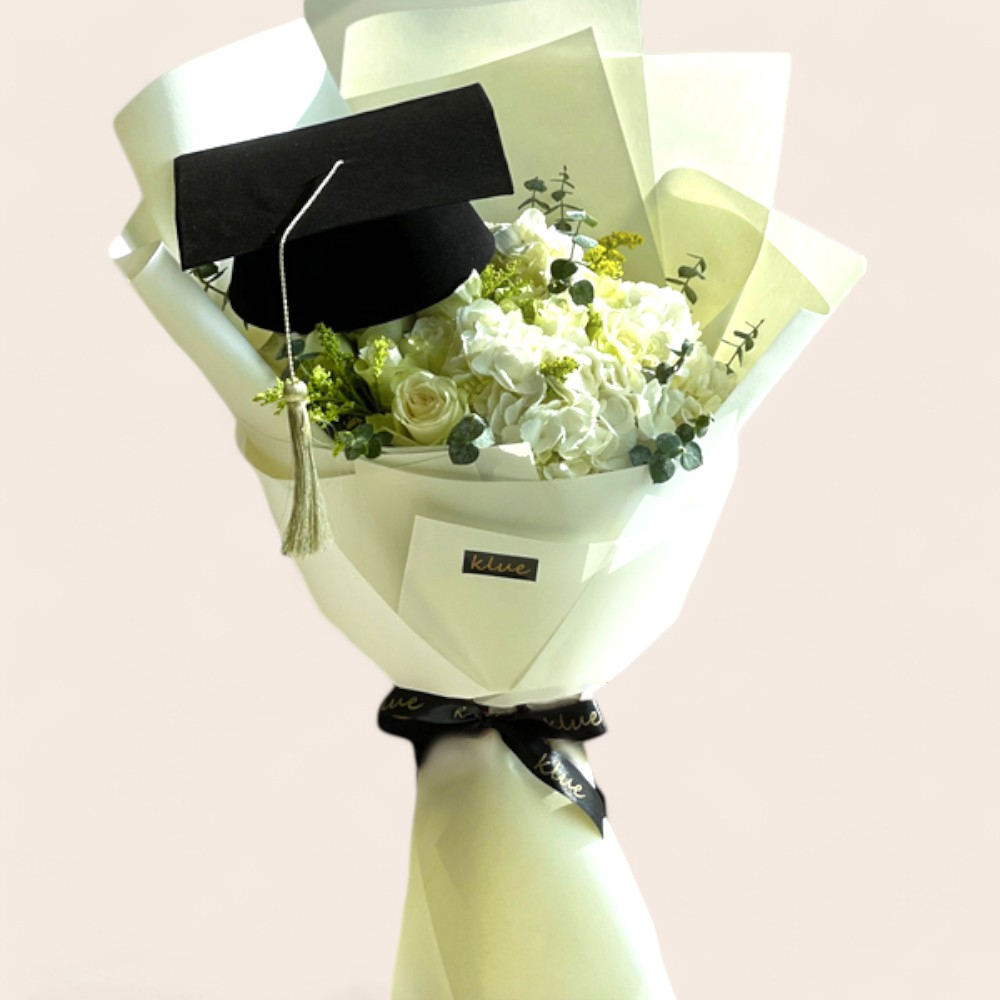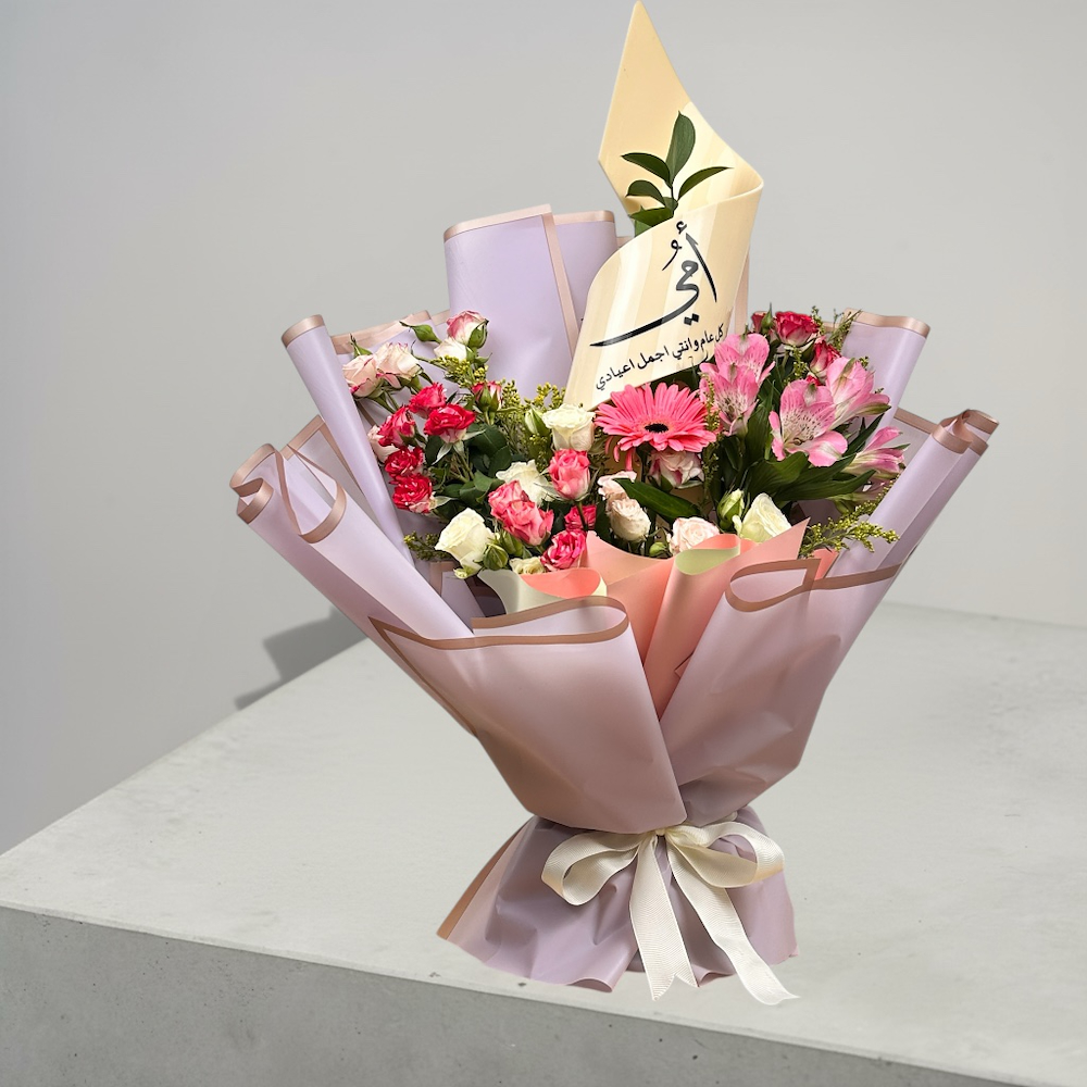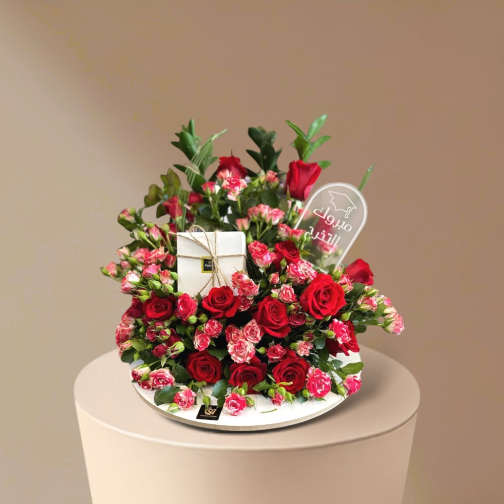 باقة تحتوي على 0.250 كيلو من شوكولاتة باتشي مع الجوري، والبيبي جوري بالإضافة الى توبر مبروك التخرج.