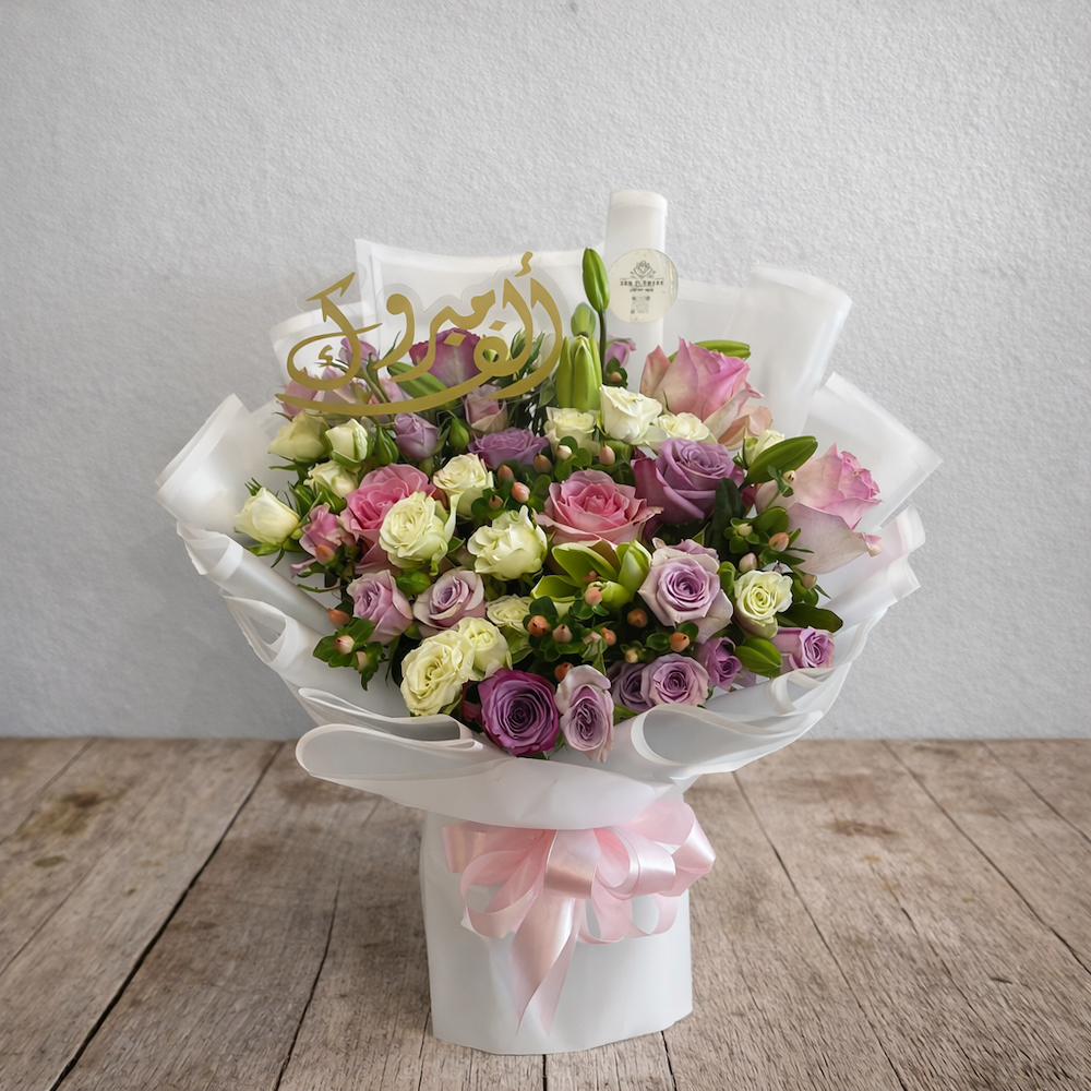 باقة أنيقة مليئة بأزهار الجوري، بيبي روز وليليز مع تغليف مميز.