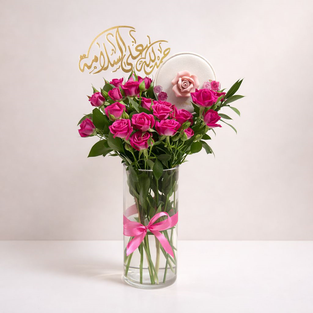 فازة زجاجية أنيقة تضم باقة من الروز الفوشيا الزاهي، مضافاً إليها علبة شوكولاتة بستاني الفاخرة. يزينها تاغ ذهبي بعبارة "حمد لله على السلامة" وفيونكة ستان وردية، لتكون هدية تعبر عن أصدق المشاعر.