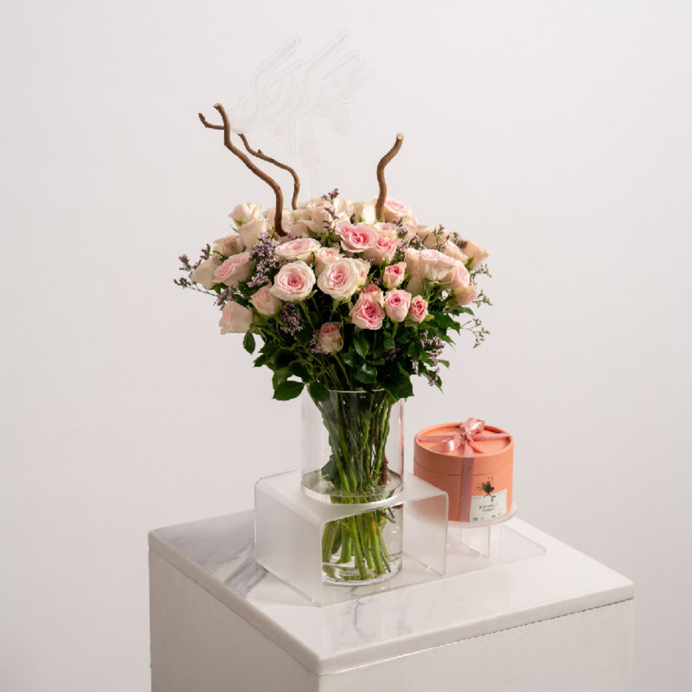 فازة تحتوي على الجوري مع 250غ من شوكولاتة انوش.