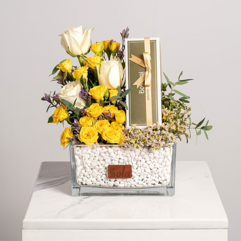 فازة تحتوي على الجوري والبيبي جوري مع 250غ من شوكولاتة بستاني.
