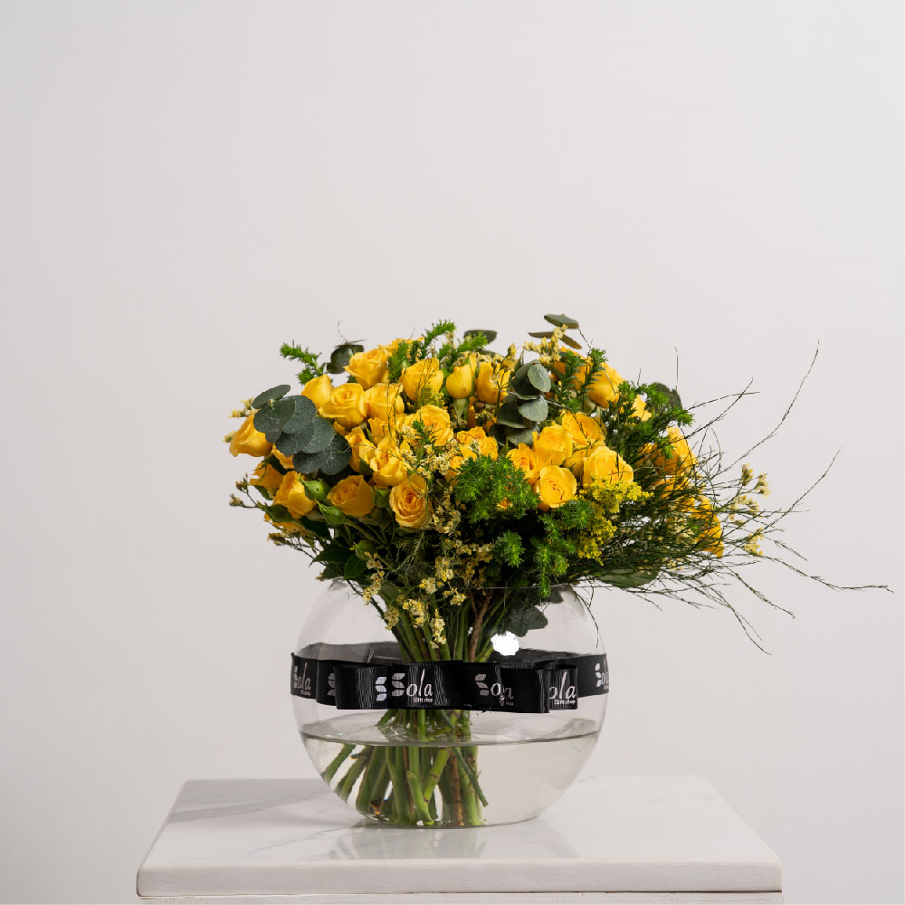 باقة تحتوي على زهور البيبي جوري الصفراء، مرتبة بشكل جميل في فازة. تعليمات العناية: قم بتغيير الماء كل يومين بماء بارد، قص طرف ساق كل يومين بشكل مائل، درجة الحرارة المناسبة 16-20 درجة مئوية.