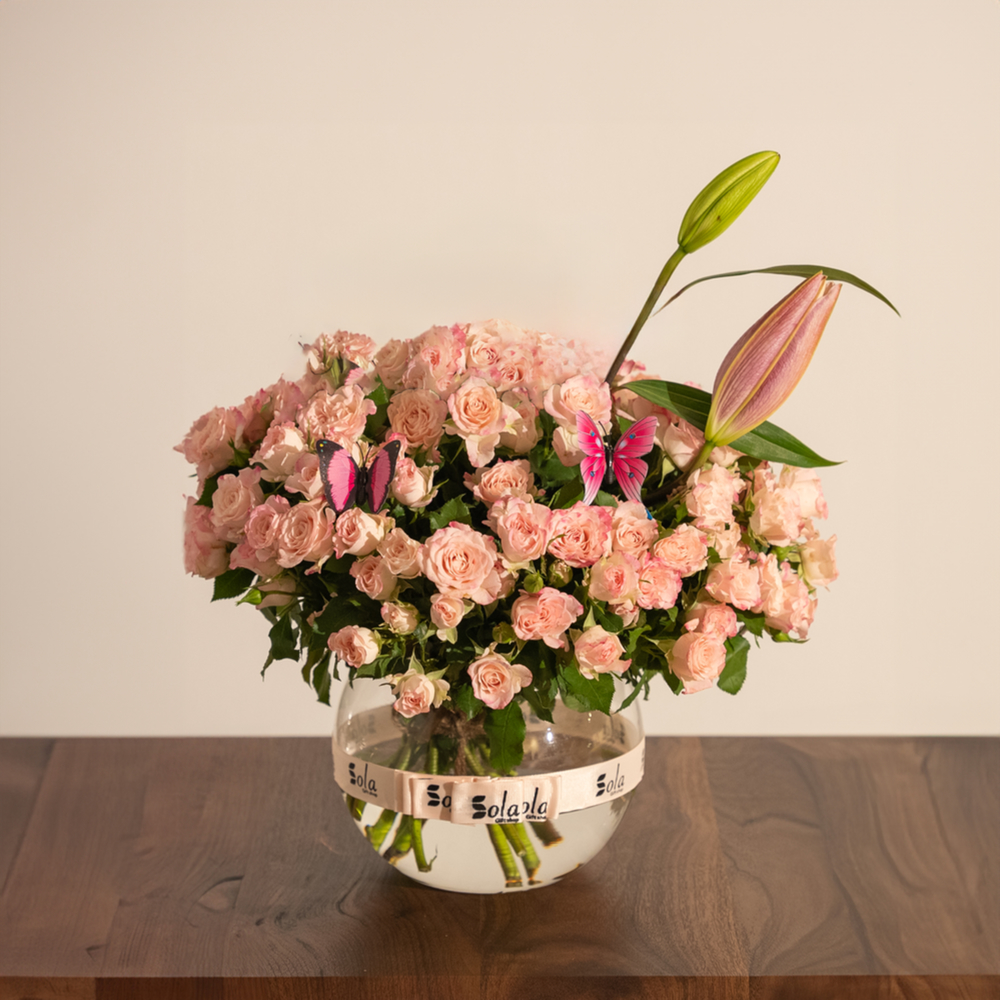 باقة تحتوي على زهور البيبي جوري والليلي الوردية، مرتبة بشكل جميل في فازة. تعليمات العناية: قم بتغيير الماء كل يومين بماء بارد، قص طرف ساق كل يومين بشكل مائل، درجة الحرارة المناسبة 16-20 درجة مئوية.