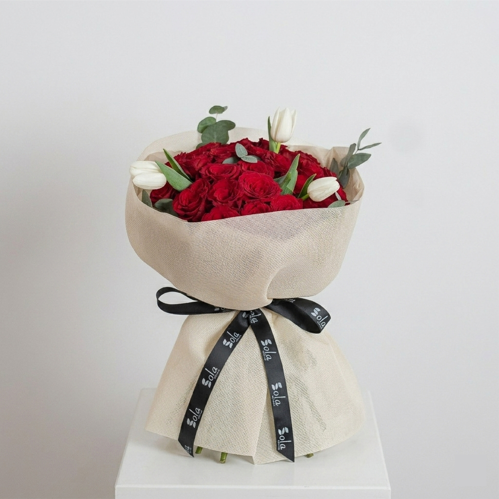 باقة يد تحتوي على زهور البيبي جوري الحمراء والتوليب البيضاء، مرتبة بشكل جميل. تعليمات العناية: قم بتغيير الماء كل يومين بماء بارد، قص طرف ساق كل يومين بشكل مائل، درجة الحرارة المناسبة 16 - 20 درجة مئوية