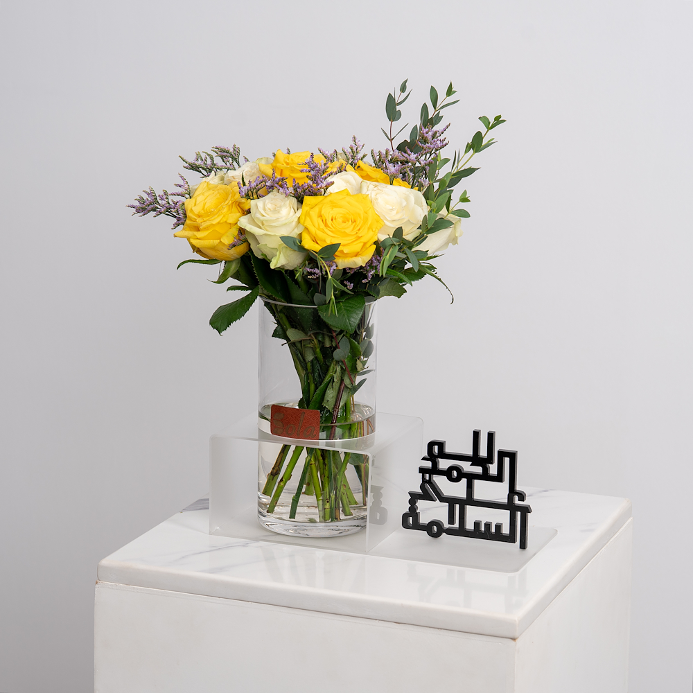 فازة تحتوي على زهور الجوري البيضاء والصفراء، مرتبة في ستاند من الأكريليك. تعليمات العناية: قم بتغيير الماء كل يومين بماء بارد، قص طرف ساق كل يومين بشكل مائل، درجة الحرارة المناسبة 16-20 درجة مئوية.