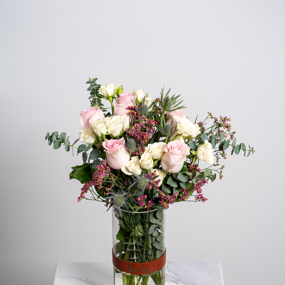 باقة تحتوي على زهور الجوري الوردية والبيبي جوري البيضاء، مرتبة بشكل جميل في فازة. تعليمات العناية: قم بتغيير الماء كل يومين بماء بارد، قص طرف ساق كل يومين بشكل مائل، درجة الحرارة المناسبة 16-20 درجة مئوية.