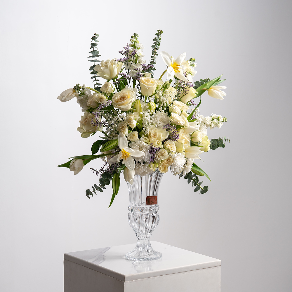 فازة تحتوي على زهور الجوري، البيبي جوري، الليلي، التوليب، الكريز والجبسوفيلا، مرتبة في فازة. تعليمات العناية: قم بتغيير الماء كل يومين بماء بارد، قص طرف ساق كل يومين بشكل مائل، درجة الحرارة المناسبة 16-20 درجة مئوية.