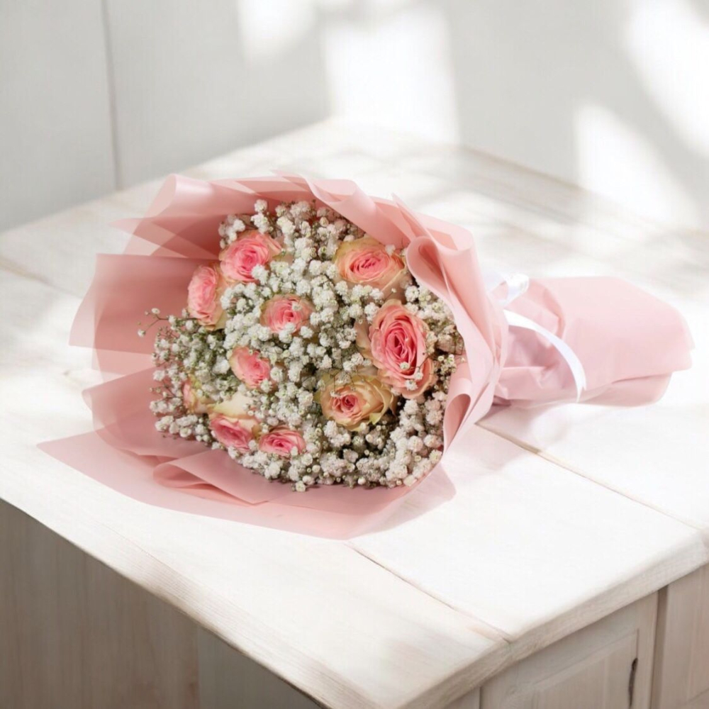 باقة مكونة من زهور الجوري والجيبسوفيليا، منسقة بحب لمن تحب.