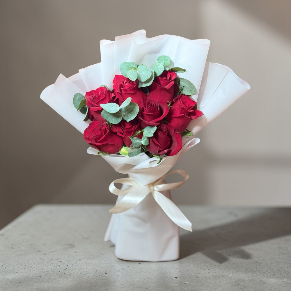 باقة أنيقة تحتوي على 8 أزهار الجوري باللون الأحمر.