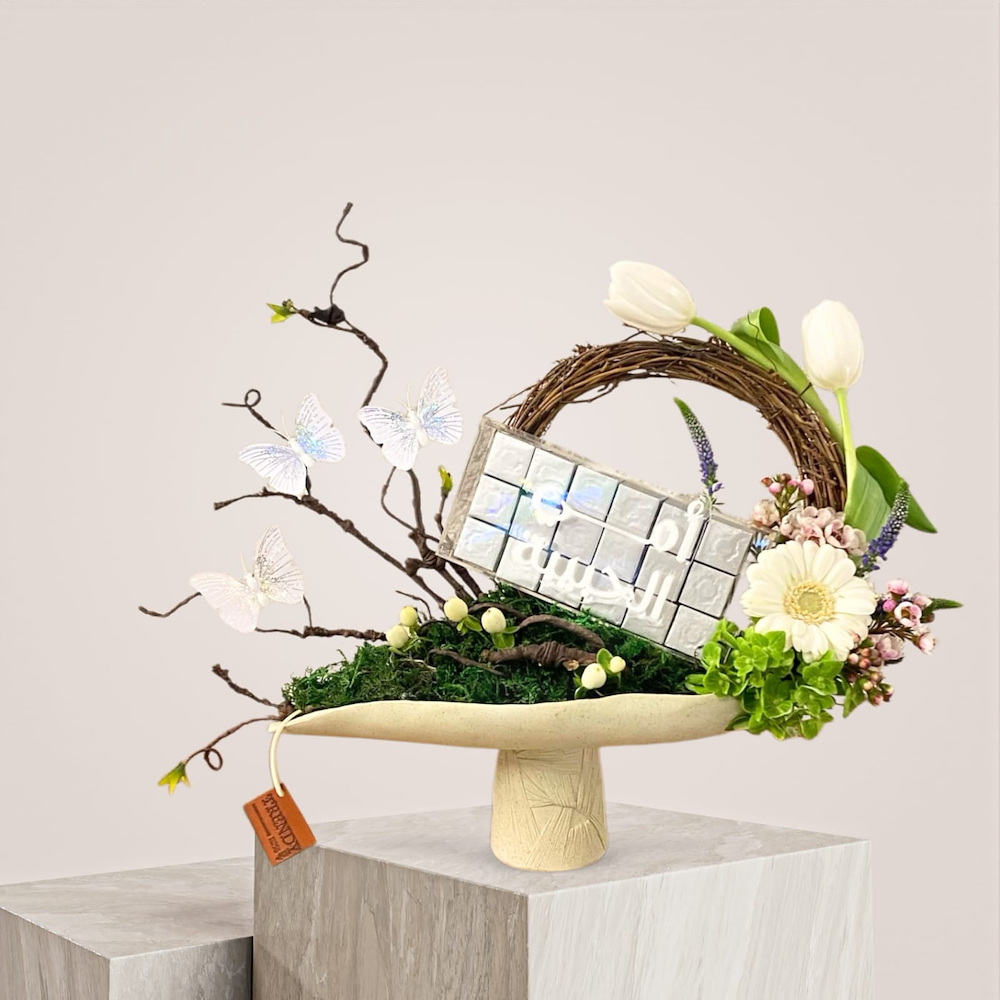 فازة أنيقة مليئة بأزهار الكوبية، الجربيرا، التوليب وأزهار الواكس مع 18 قطعة من الشوكولاتة السويسرية.