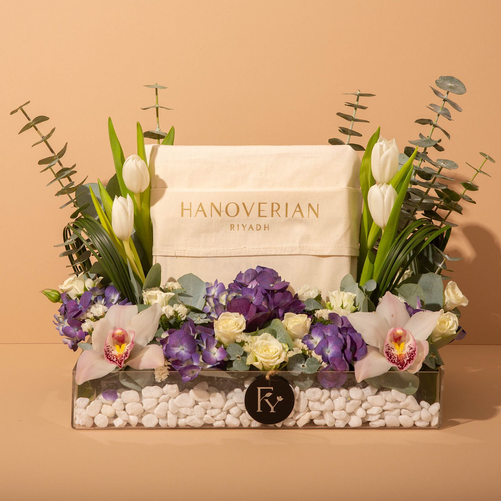 تحتوي هذه الباقة على الجوري، البيبي جوري، السيمبيديوم، والجربيرا مع علبة شوكولاتة سويسرية.