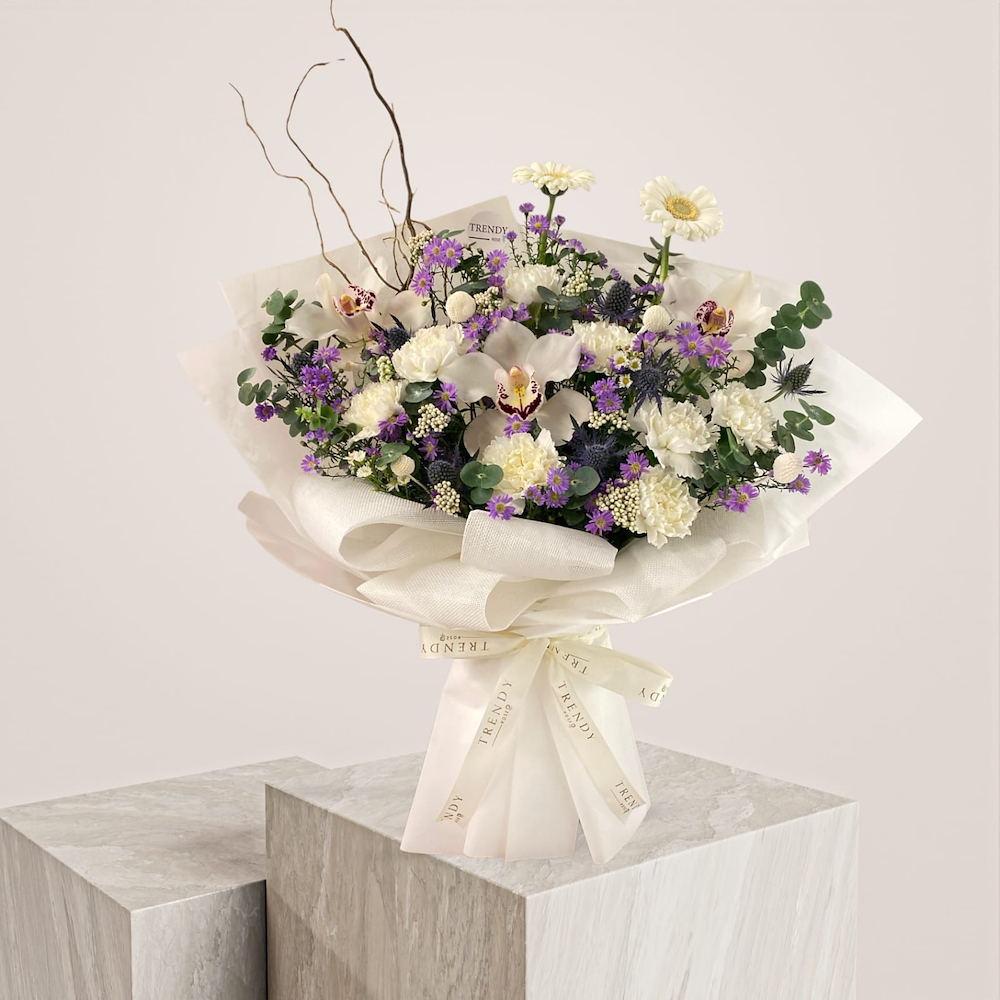 باقة مليئة بأزهار السمبيديوم والجربيرا.