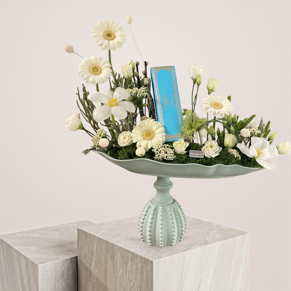 فازة فاخرة مليئة بأزهار البيبي روز والجربيرا مع 250غ من الشوكولاتة السوسرية.
