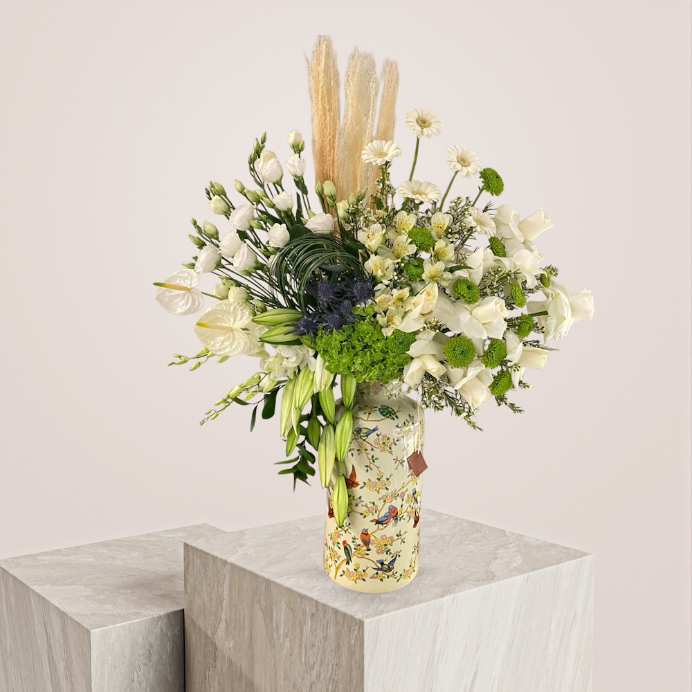 فازة مليئة بالجوري، الليليز، الالستروميريا، الجيربيرا، الاوركيد والكريز.