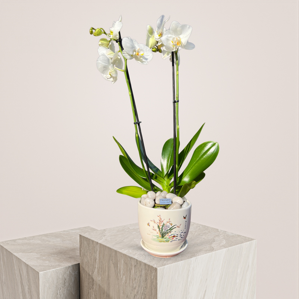 فازة مليئة بنبات الأوركيد البيضاء. ملاحظة: ارتفاع الفازه مع نبات الاوركيد 65 سم.