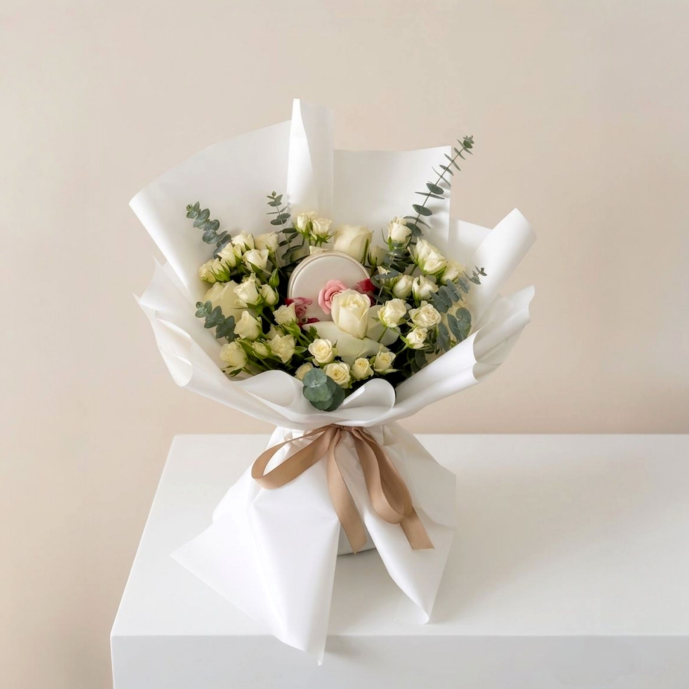 باقة يد تحتوي على زهور البيبي جوري، مرتبة بشكل جميل. تأتي مع علبة شوكولاتة من بستاني.