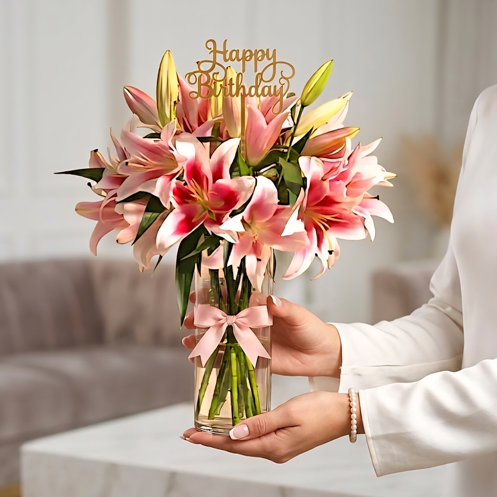 فازة أنيقة تتميز بأزهار الكازابلانكا مع تغريسة.