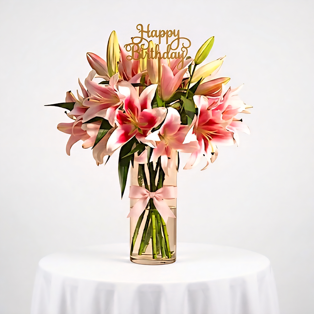 باقة أنيقة تتميز بأزهار البيبي روز والكريز مع تغريسة.