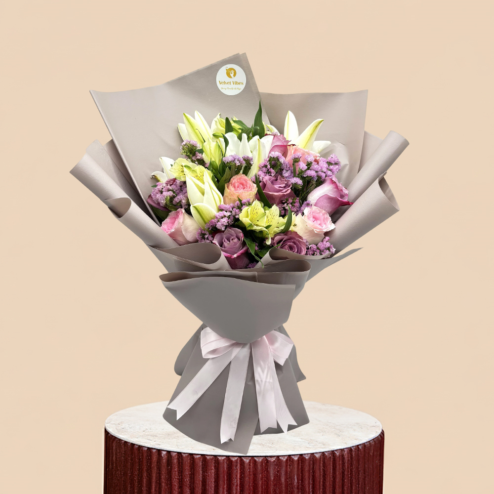 باقة تحتوي على الجوري، الليليز، الالستروميريا والستاتس.