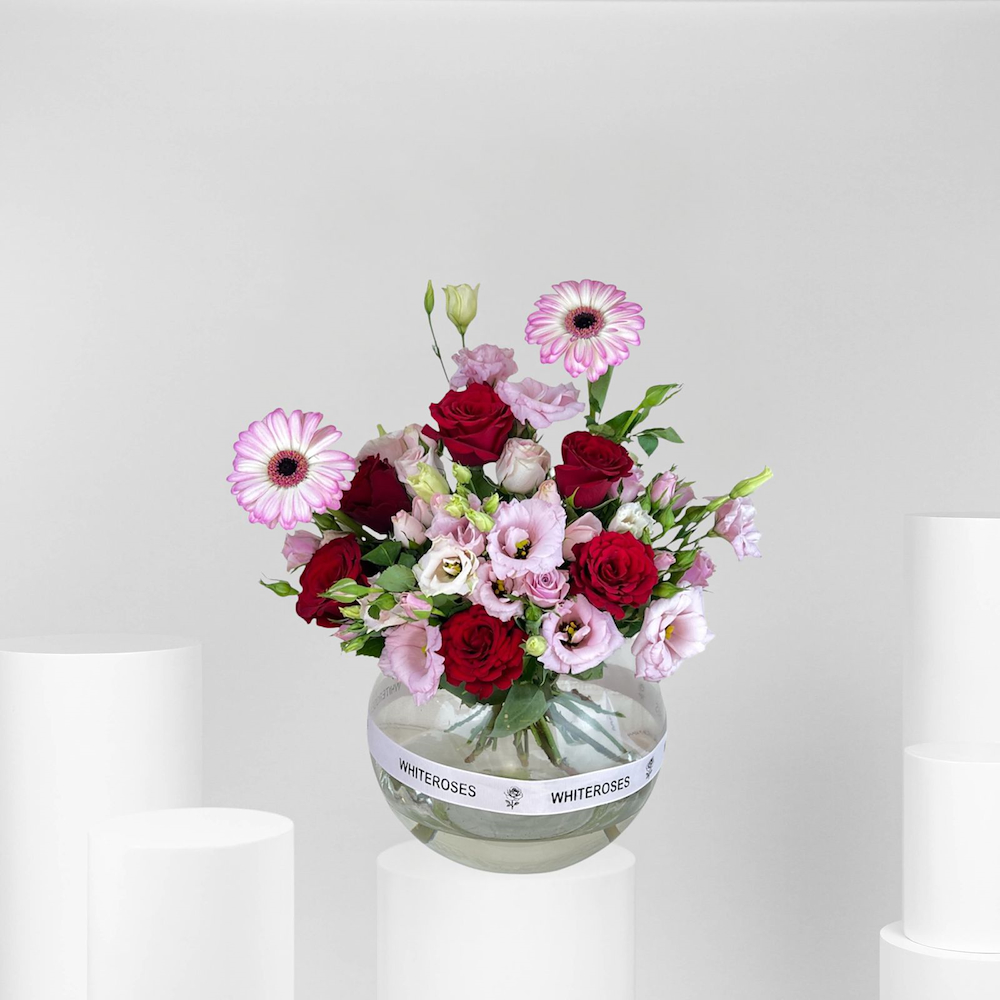 فازة تحتوي على الجوري والجيربيرا والليزيانثوس.