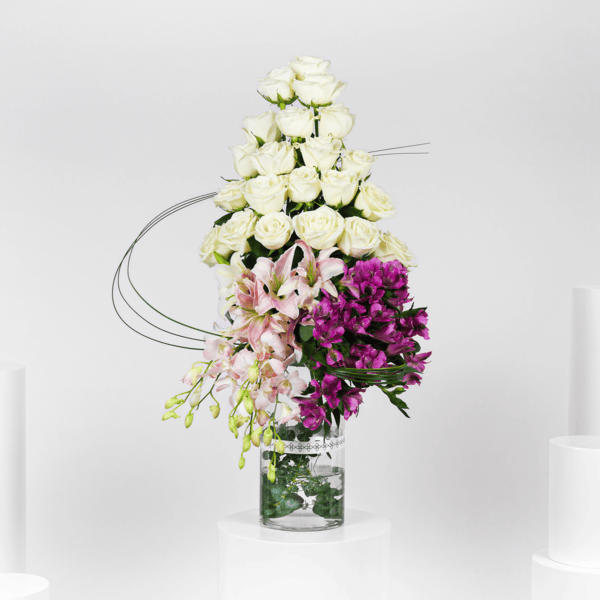 هذه الفازة مليئة بزهور الجوري، السترومريا، البيبي أوركيد وزهور الليليز.