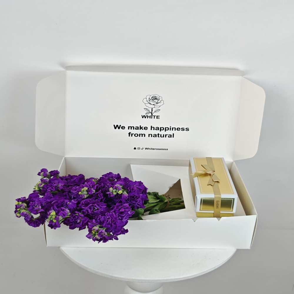 تنسيق فاخر من شوكولاتة جاردنر الفاخرة مع بوكيه أنيق من زهور الماتيولا بعبيرها الهادئ وألوانها الناعمة.