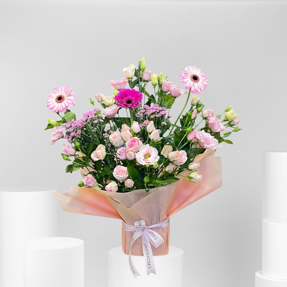 باقة تحتوي على الجوري والجيربيرا والليزيانثوس.