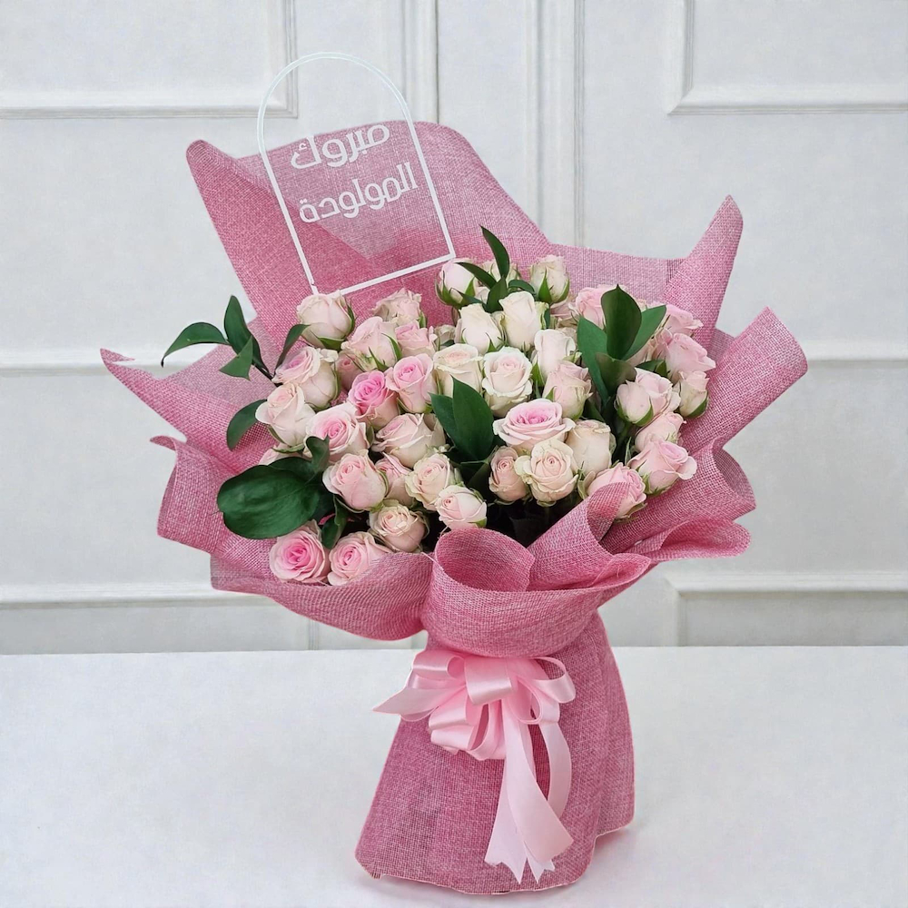 باقة يد أنيقة بأزهار بيبي جوري وأوراق روسكس بتغليف باللون الوردي، مع توبر مبروك المولود الجديد.