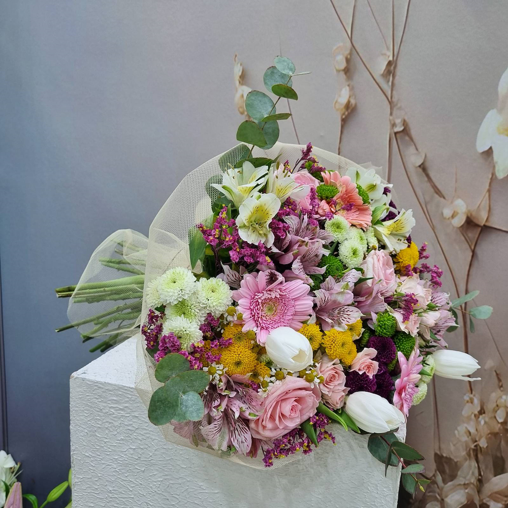 باقة مليئة بمزيج من أزهار التوليب، الجوري، الجربيرا والكريز.