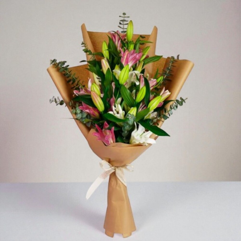 باقة يد تحتوي على 10 أزهار من الليليز وأوراق الأوكالبتوس.