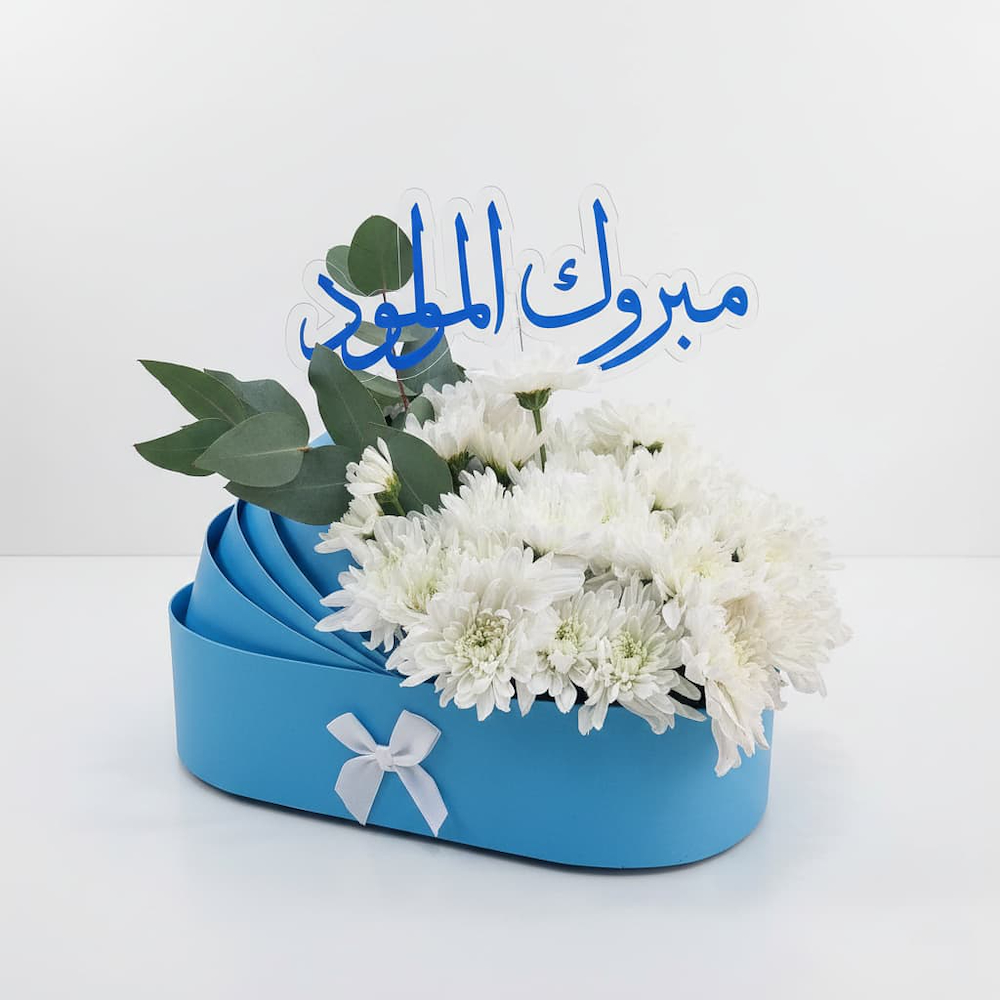 تحتوي الهدية على كريز ابيض مع اغصان الاكالوبتوس منسقة في بوكس ازرق بمناسبة المولود ولد مع تغريسة مبروك المولود.