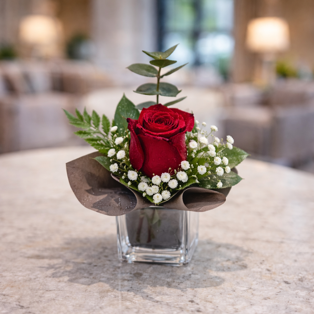 باقة تحتوي على زهرة جوري حمراء والجبسوفيلا، مرتبة بشكل جميل في فازة.