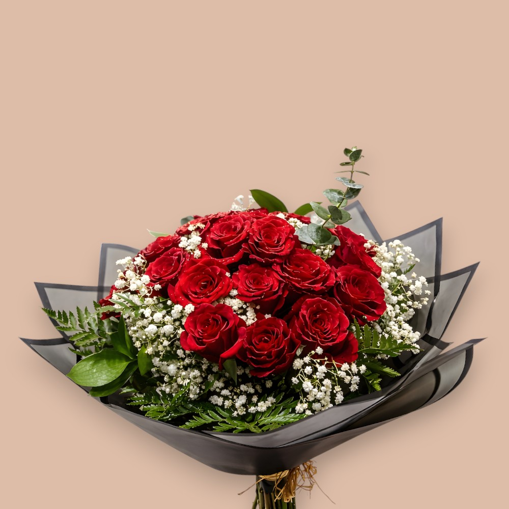 باقة تحتوي على 20 زهرة من الجوري الفاخرة باللون الأحمر.