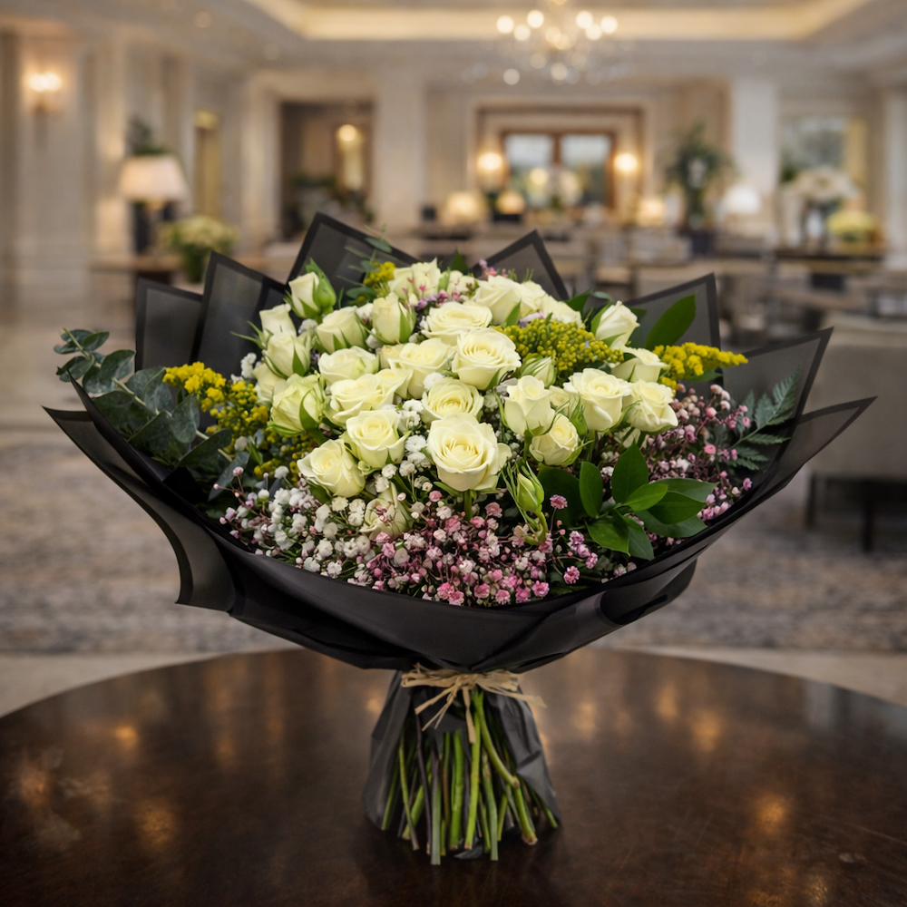 باقة يد تحتوي على زهور البيبي جوري والجبسوفيلا، مرتبة بشكل جميل.