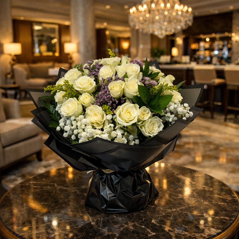 باقة يد تحتوي على زهور البيبي جوري والجبسوفيلا، مرتبة بشكل جميل.