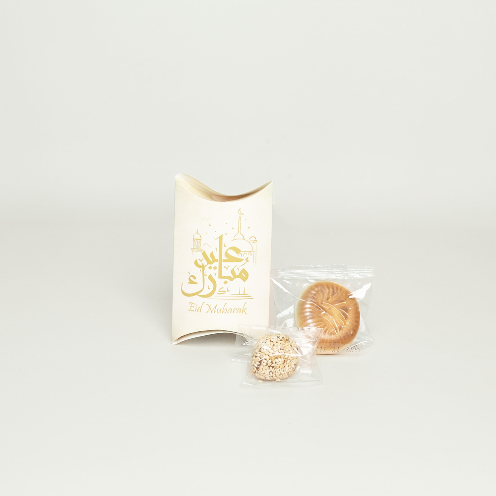 صينية خشبية تحتوي على 12 كيس بلاستيكي، داخل كل كيس قطعتين معمول.
