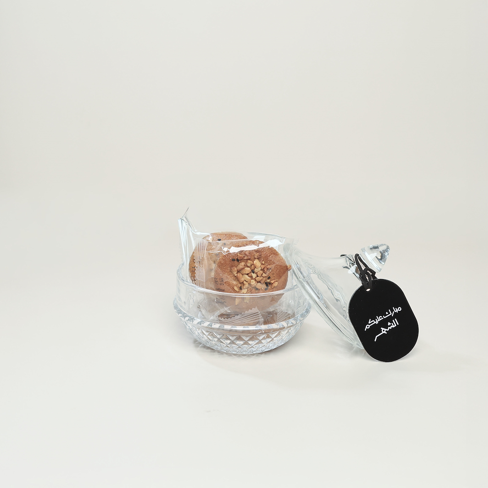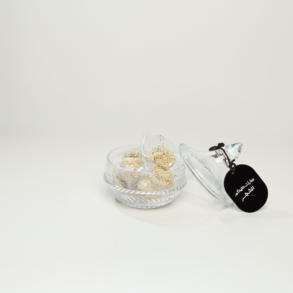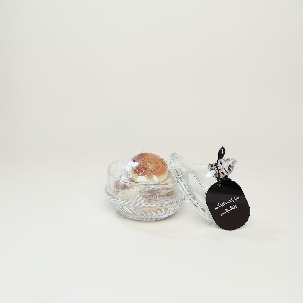 صينية خشبية تحتوي على 3 جرات زجاجية فاخرة، تضم 3 أنواع من كوكيز حساوي، معمول تمر، ومعمول طحينة.