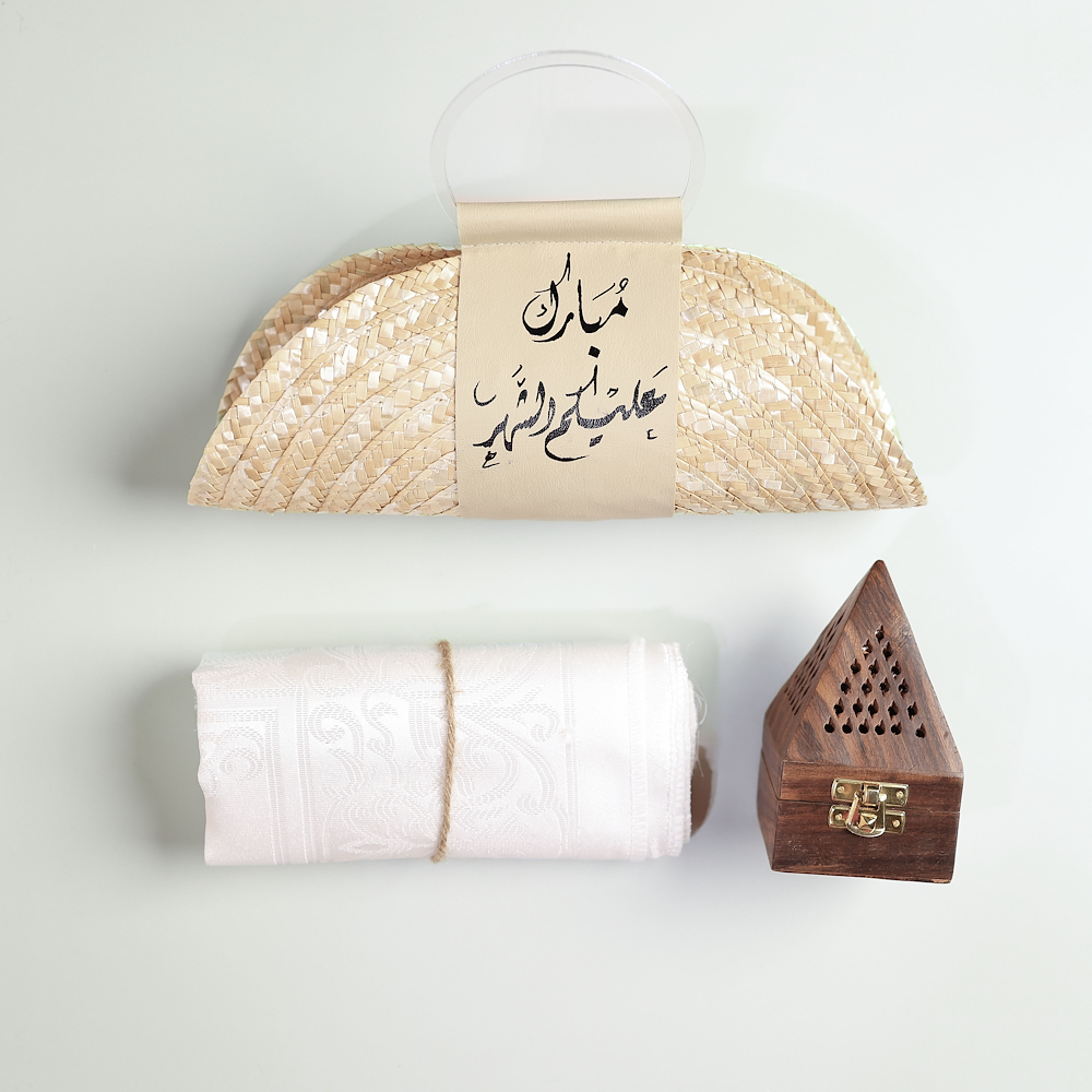 سلة تضم مبخر، مسبحة، وسجادة صلاة.