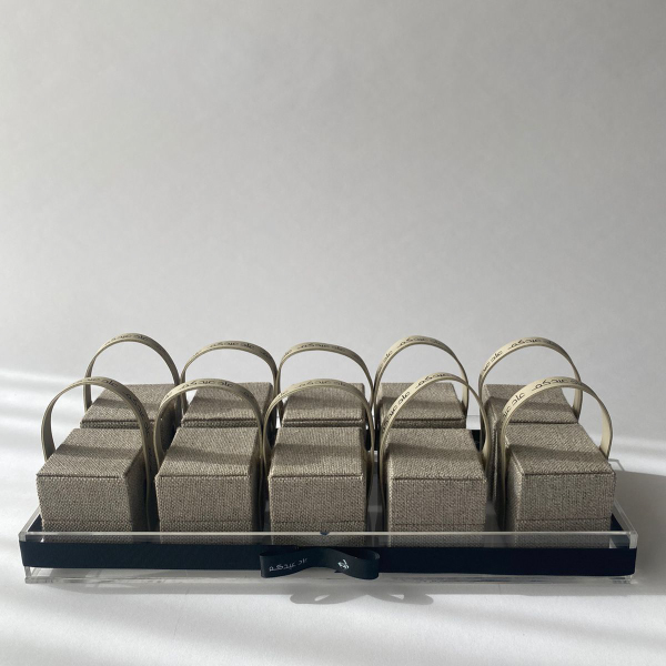 صينية اكريليك بتوزيعات قُماشية 10 حبات صينية اكريليك ممتازة، تم تصنيعها من مكونات ذات جودة عالية، وتصميمها بطريقة حديثة ومبتكرة حتى تناسب الأذواق الرفيعة، تحتوي على صناديق قُماشية أنيقة وبلون ناعم رمادي، مُضاف عليه من الخارج حزام جلدي مطبوع عليه عبارة (عاد عيادكم). كما تم ترصيع الصينية بشريطة ريبون أنيقة. مميزات المنتج ملائمة للإهداء أو حتى للتوزيع بضيافة العيد. صينية أنيقة بتصميم مميز وإطلالة جذابة تفاصيل المنتج - صينية اكريليك-صندوق قماشي( عدد 10) - حزام من الجلد مطبوع عليه (عاد عيدكم).