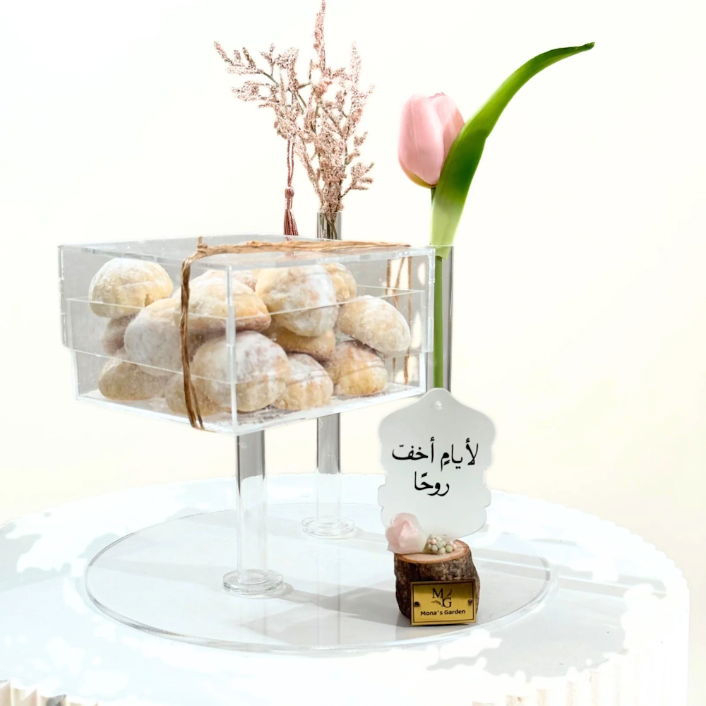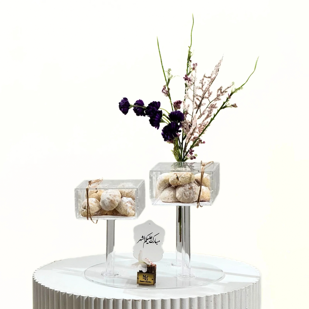 هديه عمليه واقتصاديه عباره عن علبتين أكريلك . بغطائين البسكوت والشوكولاتة مع فازه ميني للضيافه. وشرشف بعباره مبارك عليكم الشهر بالاضافه الى نوعان من بسكوت الشوكولاتة.