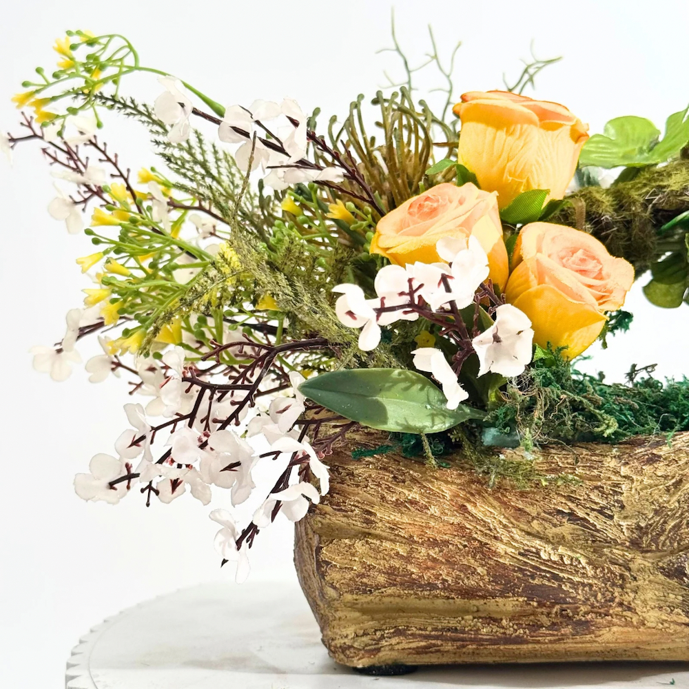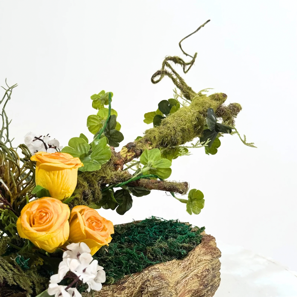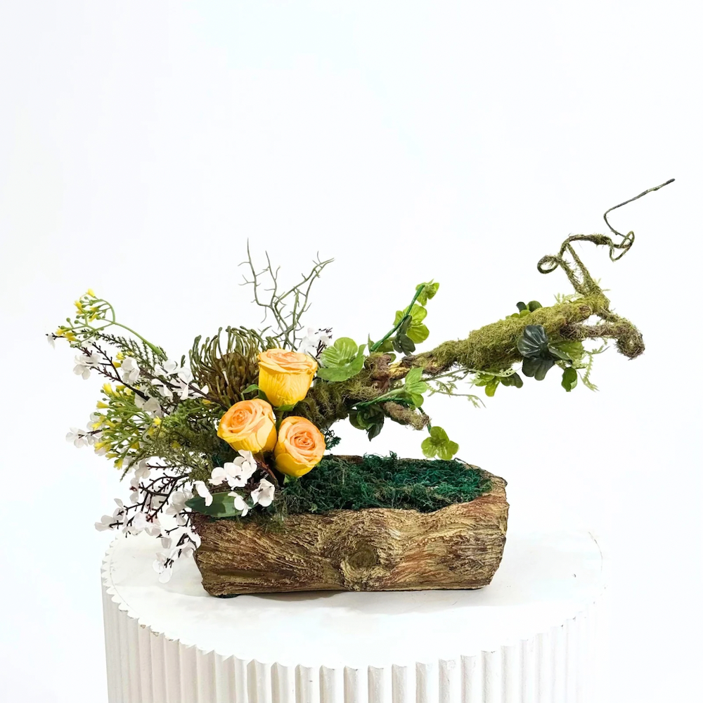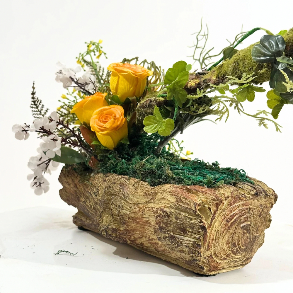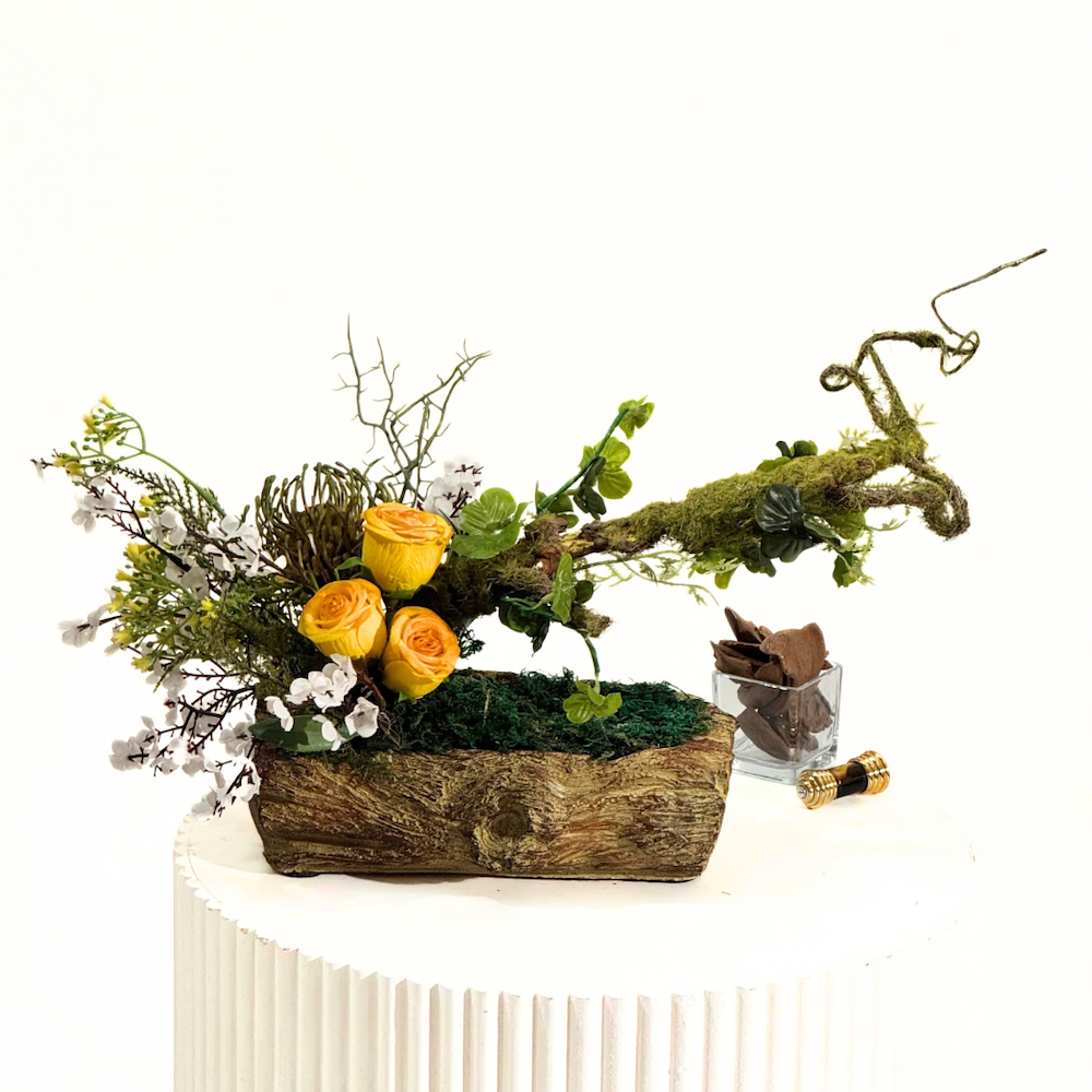 تنسيق فاخر مستوحى من جمال الغابات، يجمع بين الورد الأصفر وسط قاعدة جذع خشبي طبيعي يمنح لمسة ريفيّة . تتداخل معه فروع خضراء متسلّقة وزهور بيضاء ناعمة تضيف إحساسًا بالانتعاش، لمسة الطحالب الخضراء والأغصان الملتفّة تمنح الترتيب عمقًا وحيوية وكأنه قطعة فنية من الطبيعة نفسها.