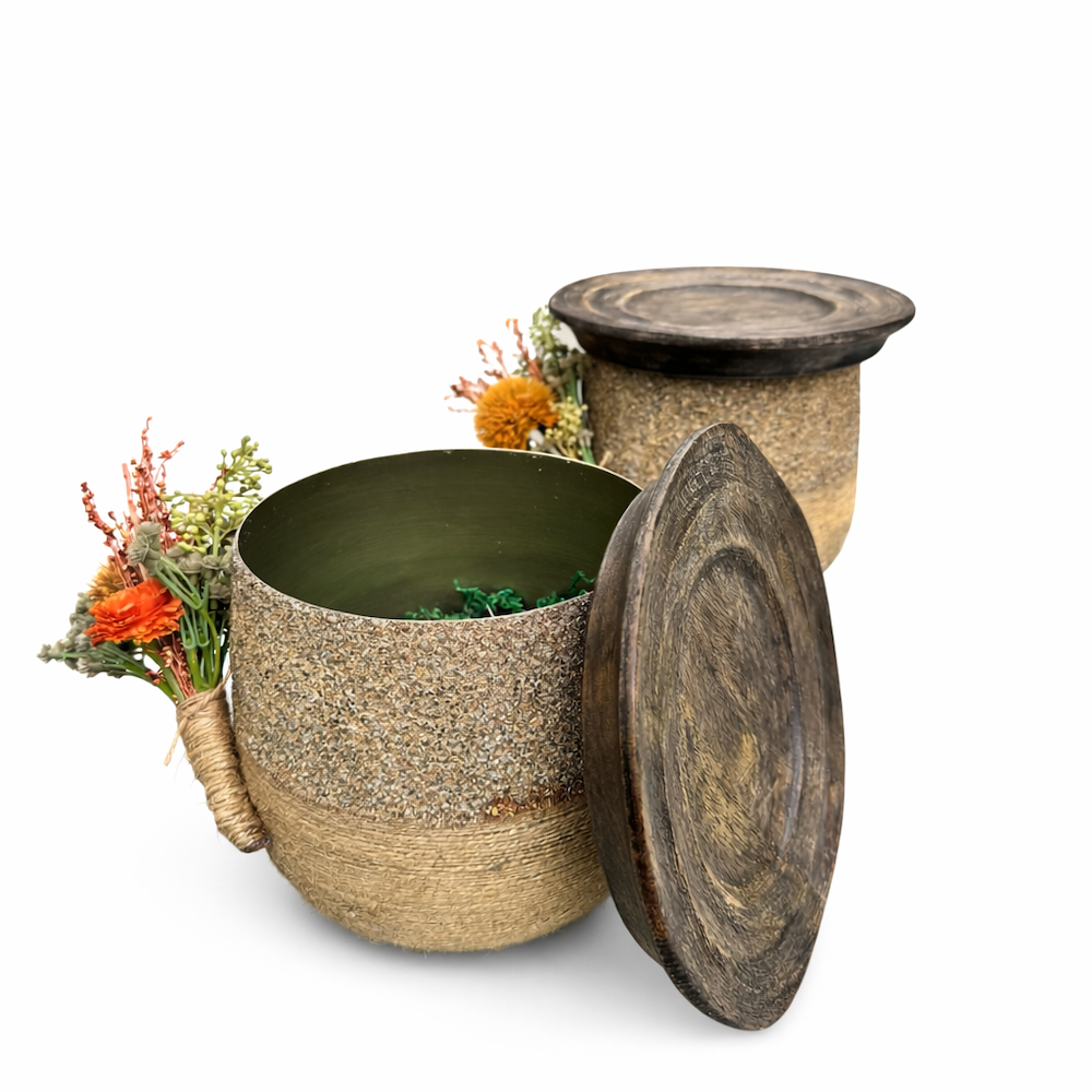وعاء أنيق مستوحى من التراث بتصميم طبيعي يجمع بين الخامات الريفية والطابع الهادئ، مزين بحبل من الأزهار المجففة مع لمسات أنيقة، وياتي بغطاء خشبي أنيق، مثالي لتقديم الحلويات التقليدية او الضيافة ويعد قطعة مميزة للتجمعات والمناسبات الخاصة والهدايا.