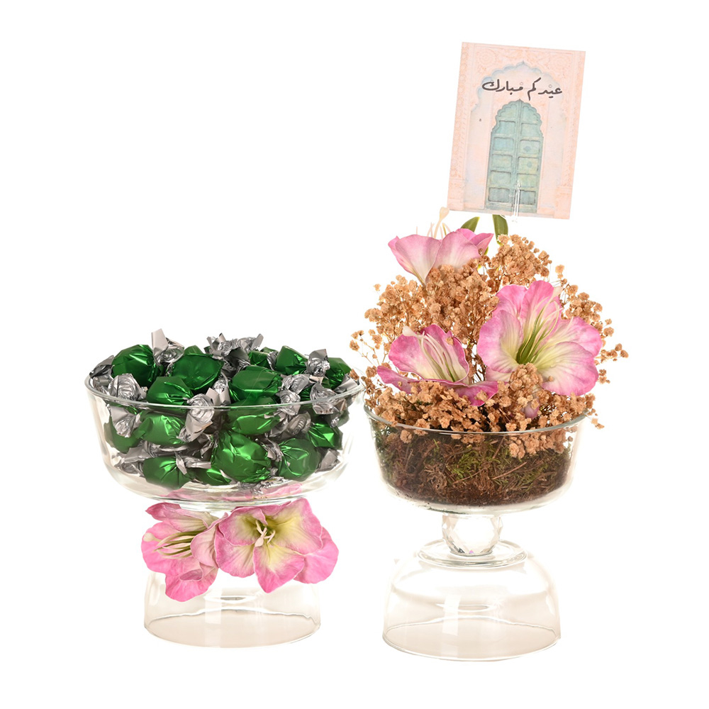 An elegant and modern Eid gift and hospitality set featuring two stylish glass bowls arranged in a refined presentation, the first bowl contains 50 pieces of premium Pistachio & Kunafa chocolates, while the second bowl is beautifully decorated with vibrant flowers and an Eid greeting card, making it a perfect choice for gifting or festive serving.