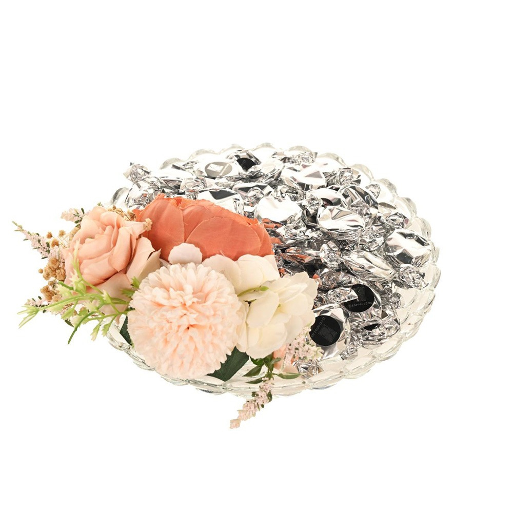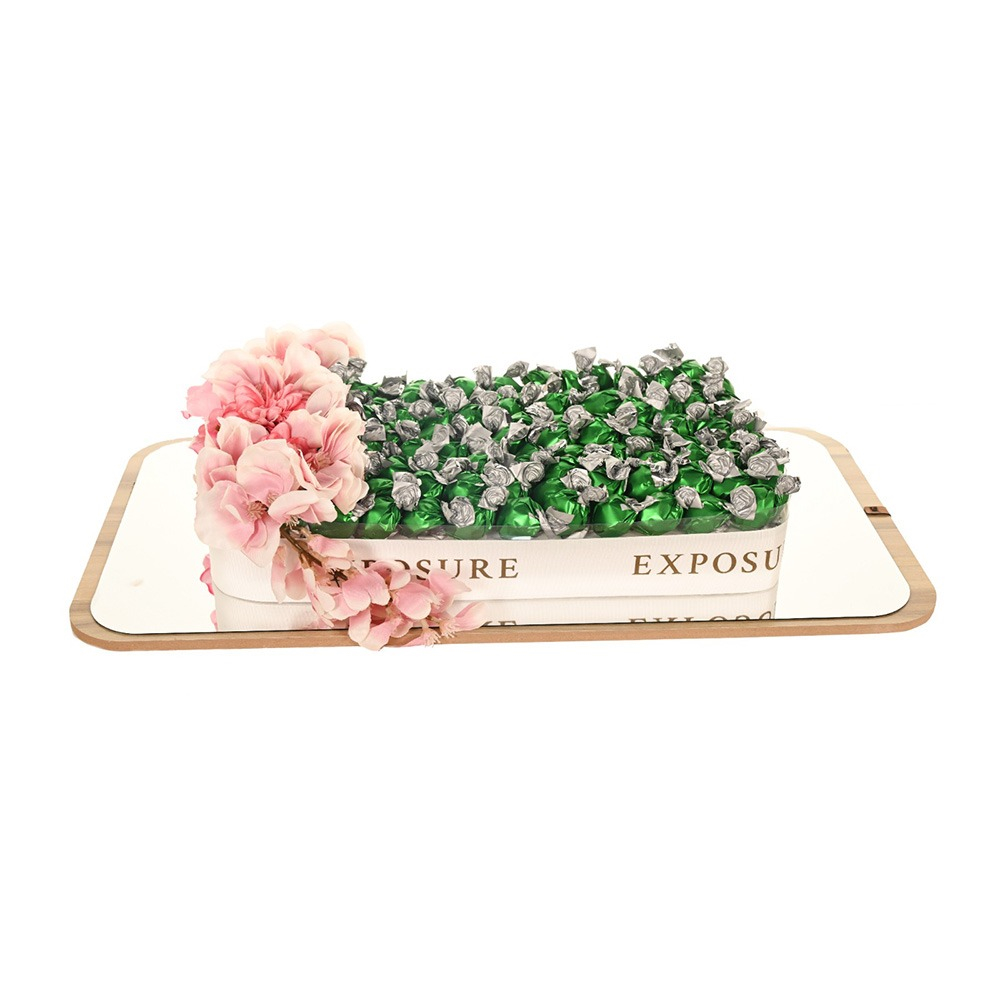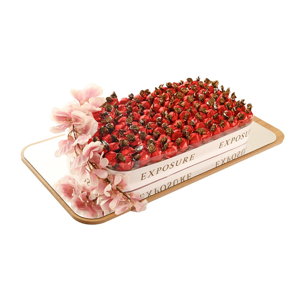 An elegant mirror tray featuring 100 pieces of premium toffee chocolate and decorated with flowers.